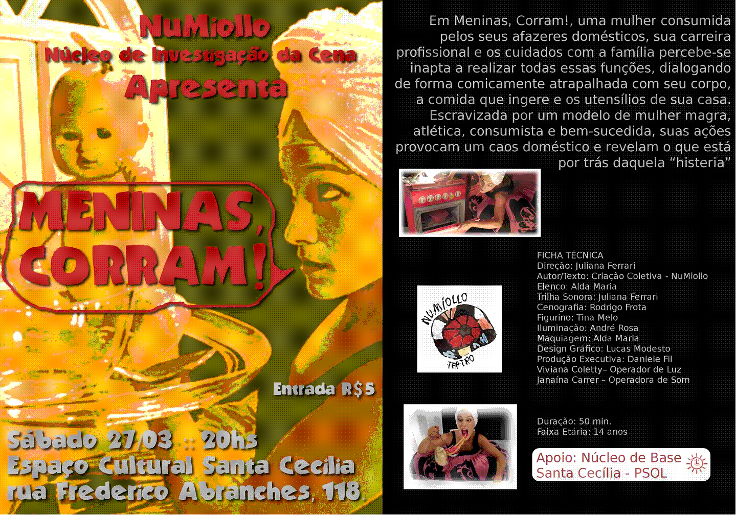 grupos NuMiollo e Núcleo Santa Cecília convidam para o espetáculo “Meninas,Corram”.