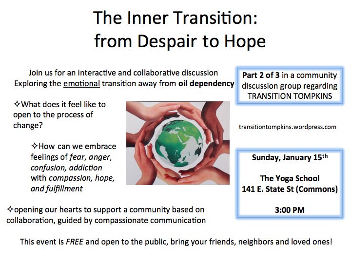> Part 2 of 3 Transition Tompkins Discussions: Transitioning Our Hearts will be on January 15th, 2012 at 2pm, at The Yoga School (in the Old Bryne Dairy Building on the Commons, above the Maté Factor).