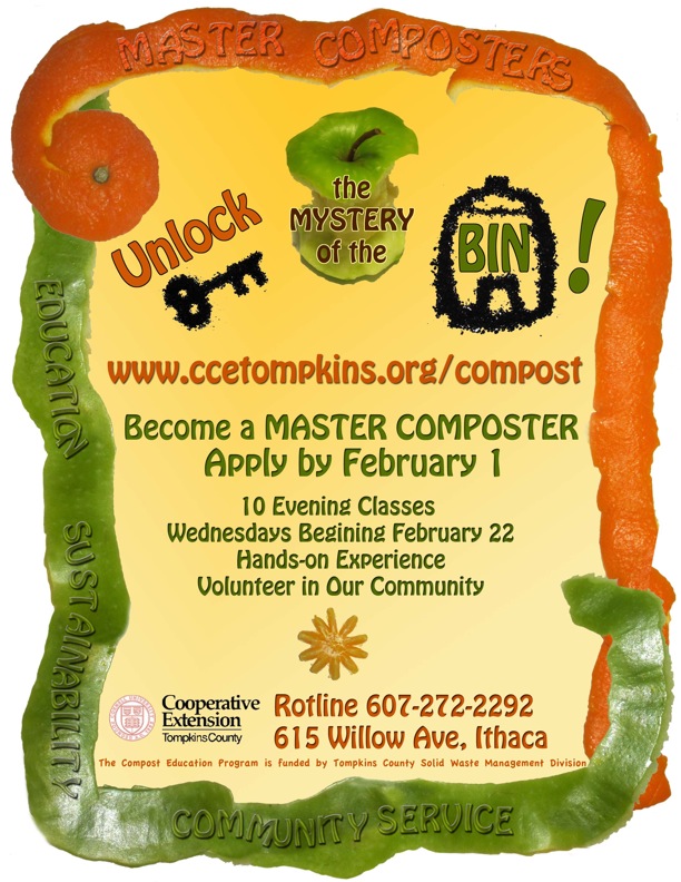 Classes are Wednesday evenings from February 22nd - May 2nd. Application deadline is Wednesday, February 1st. For more information or to request an application, call the Rotline (272-2292), contact Mila Fournier at ymf5 at cornell.edu<mailto:ymf5 at cornell.edu> or stop by the Cooperative Extension at 615 Willow Avenue in Ithaca. More info and applications also available online: http://ccetompkins.org/garden/composting/become-master-composter
