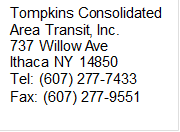 > TCAT, Inc. (Tompkins Consolidated Area Transit, Inc.) is a not-for-profit corporation that provides public transportation for Tompkins County. TCAT’s annual ridership is approximately 4.3 million annual trips, covering a distance of about 1.6 million miles. The fleet of approximately 50 buses currently includes 8 hybrid electric-diesel buses. TCAT also offers ADA Paratransit services via a contract with Gadabout Transportation Services. For more information about TCAT, please visit www.tcatbus.com or call (607) 277-RIDE. Twitter: TCATrides. Facebook: EverythingTCAT.