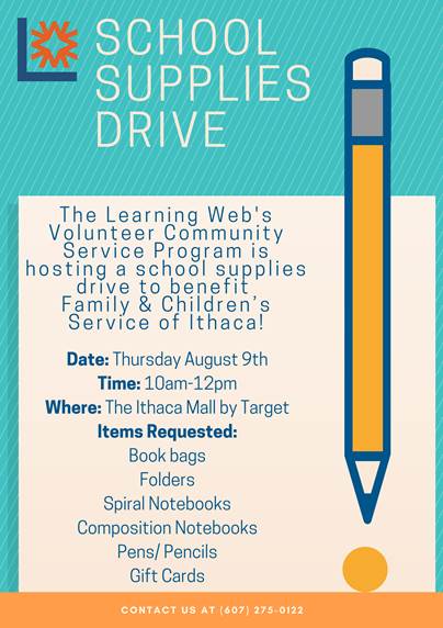 > Yep! School is going to start in the blink of an eye. Help every student have a good start by dropping off school supplies at our middle school service group’s supply drive tomorrow (Thursday 8/8) at The Ithaca Mall by Target. See details below
