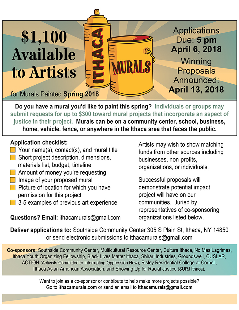 > Do you have a mural you’d like to paint this spring? Individuals or groups may submit requests for up to $300 toward mural projects that incorporate an aspect of justice in their project. Murals can be on/in a community center, school, business, home, vehicle, fence, or anywhere in the Ithaca area that faces the public. Applicants need permission for location prior to applying.